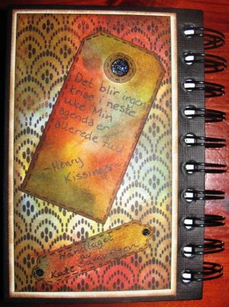 Her er et litt dårlig bilde av framsida slik den var før og slik den er nå. Både bakgrunnen, tagen og det andre er farget med Distress Ink. Stempelet er også malt med Distress Ink. Det er første gang jeg gjør, men det var veldig gøy, så jeg er hektet.